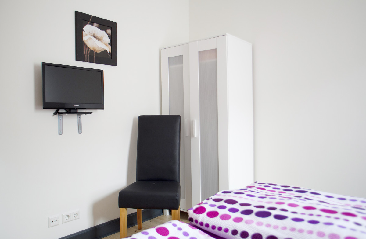 Jedes Schlafzimmer mit Flachbildschirm, Kleiderschrank, Tisch und Stühlen.